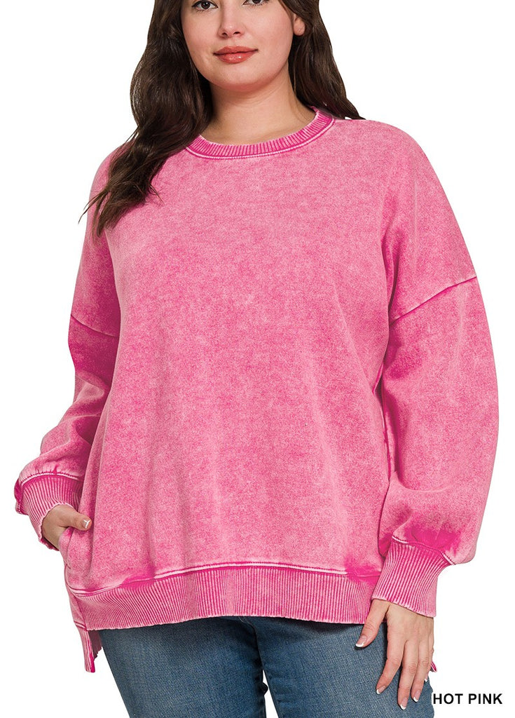 PLUS ACID WASH FLEECE HI-LOW HEM PULLOVER WITH POCKETS By Zenana